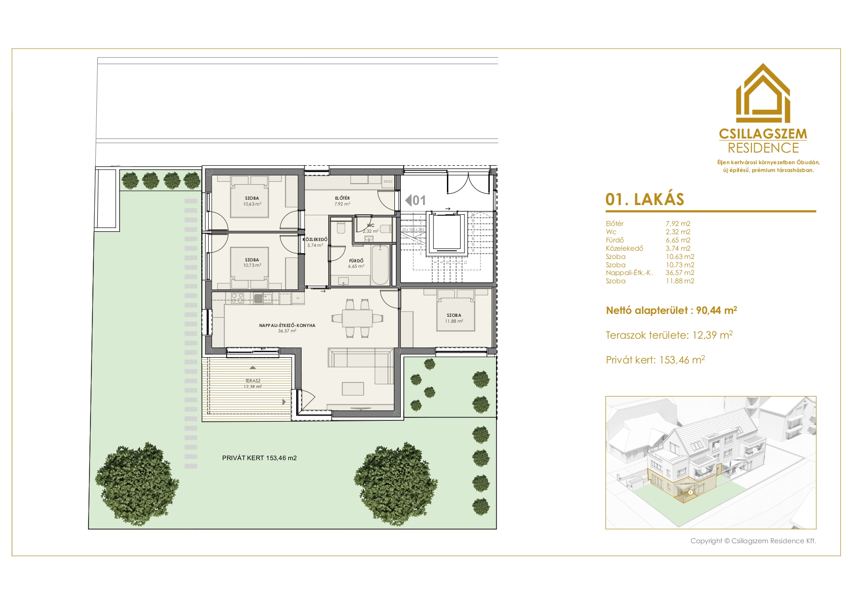 01. lakás: 90,44 m2 + terasz 12,39 m2 + saját kertrész 153,5 m2